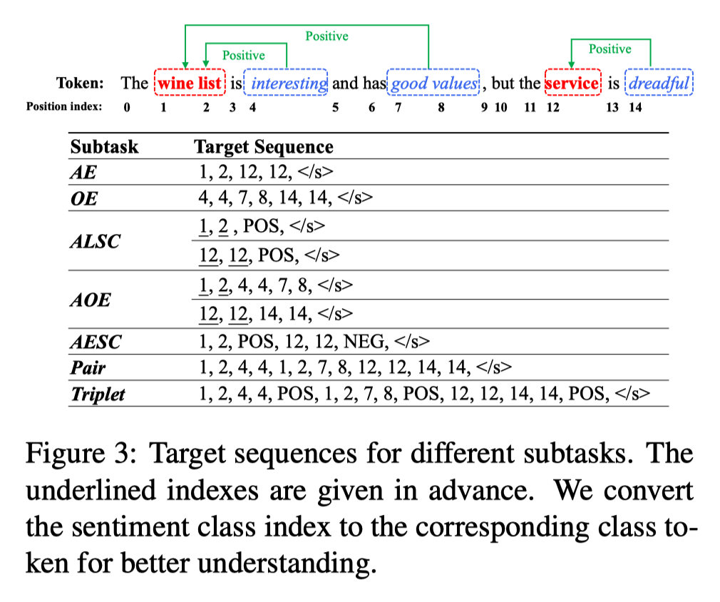 - 生成模型的vocabulary包括三部分: 1) sos, eos; 2) 不同的情感极性; 3) 用token的index标识的 aspect和opinion 的首尾位置.
