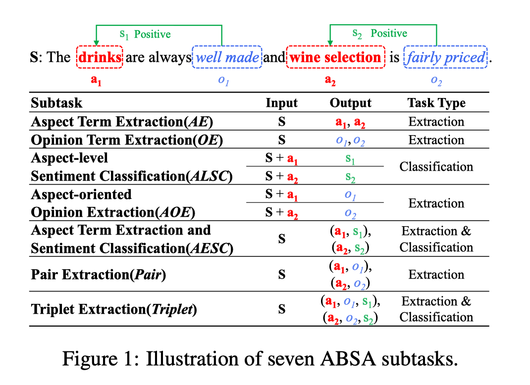 - Pair extraction task: 输出涉及两个元素,所以是以二元组的形式输出 - Aspect-opinion pair extraction (AOPE):挖掘出(aspect term, opinion term) pairs。 - End-to-End ABSA (E2E-ABSA):挖掘出 (aspect term, sentiment polarity) pairs。由于这两个元素非常重要(让人迅速了解在什么方面上表现出了什么样极性的情感),属于最早被研究的 compound ABSA 任务,所以(早期)很多论文也会直接称这个任务为“ABSA” 或 “unified ABSA”,这里为了不导致歧义,我们用“E2E-ABSA” 来称呼这个任务。 - Aspect category sentiment analysis (ACSA): 挖掘出 (aspect category, sentiment polarity) pairs,类似于E2E-ABSA任务,但此时用 category 来指代aspect,从而即使面对被隐式表达的aspect(aspect term为none),模型也可以提供解。