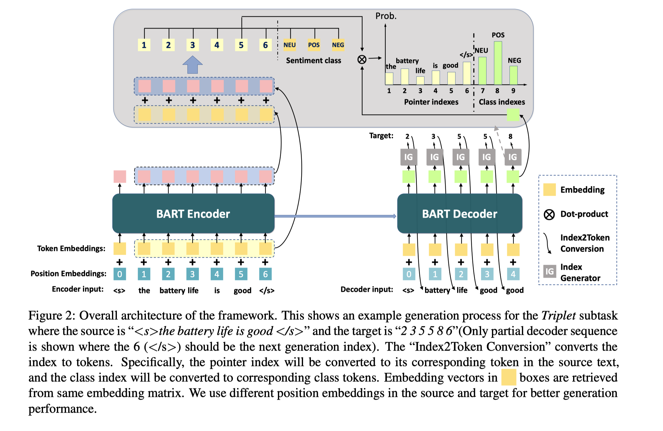 - 贡献: 1) 汇总了ABSA的不同形式, 主要针对 (aspect, opinion, polarity) 三元组抽取; 2) 将两类任务都转化为生成任务, 利用BART来生成 a/o 的位置 (vocabulary 包括 token的index 和 情感极性)