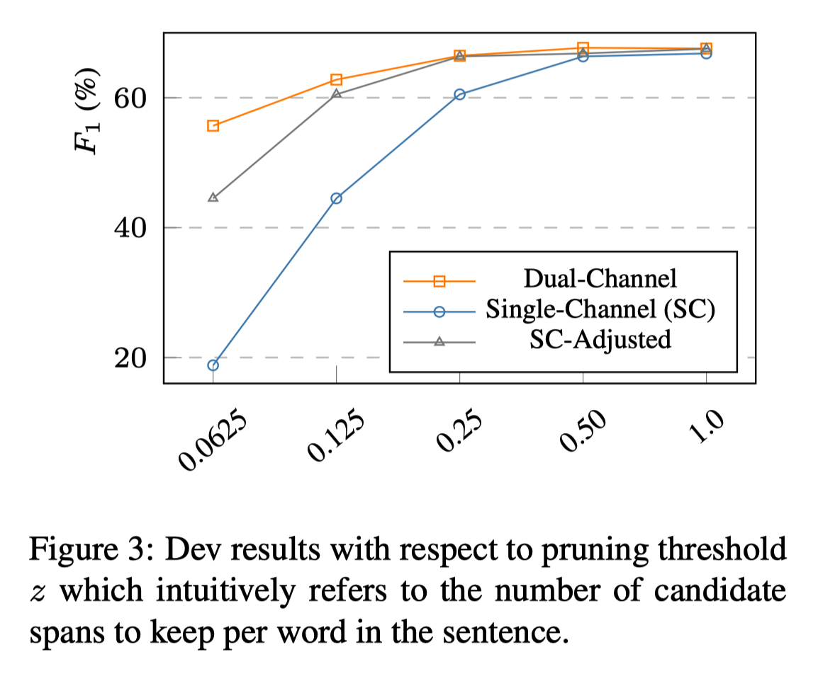 在第二个模块中, 对于每一个span进行三分类: {Target, Opinion, Invalid } (FFN). 这里强调的「双通道剪枝」其实就是针对 a/o 设置不同的阈值, 得到两个候选池.