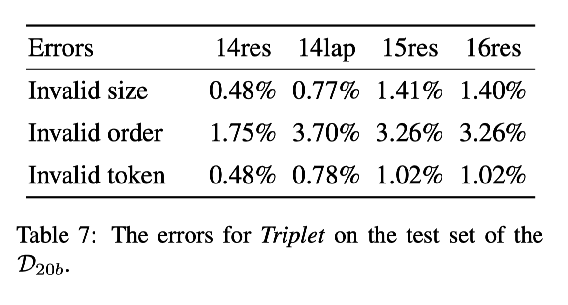 另外, 生成的序列有可能是非法的, 因此对于生成结果的质量进行分析. 下图中 1) invalid size 表示每一组的长度不为5; 2) invalid order 表示一个 span 的首尾不合法; 3) invalid token, 一个词经过 BART分词之后有多个token, 需要预测的所有 index 都是每一组token中的第一个.