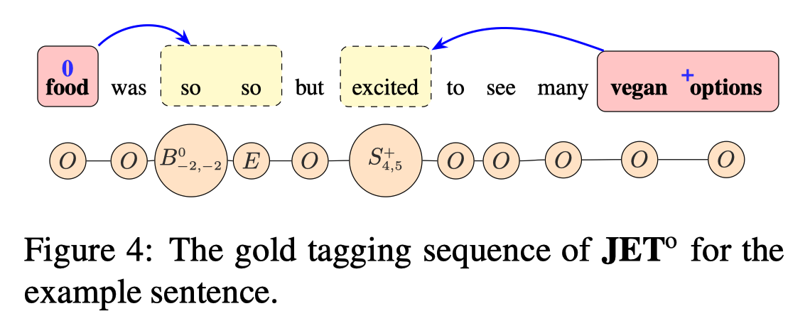 - 贡献: 1) 提出了一种新的 position-aware tagging scheme, 可以感知到ABSA中三个成分之间的距离; 2) 提出了针对这种 tagging 的JET模型, 主要是对 CRF框架的修改.