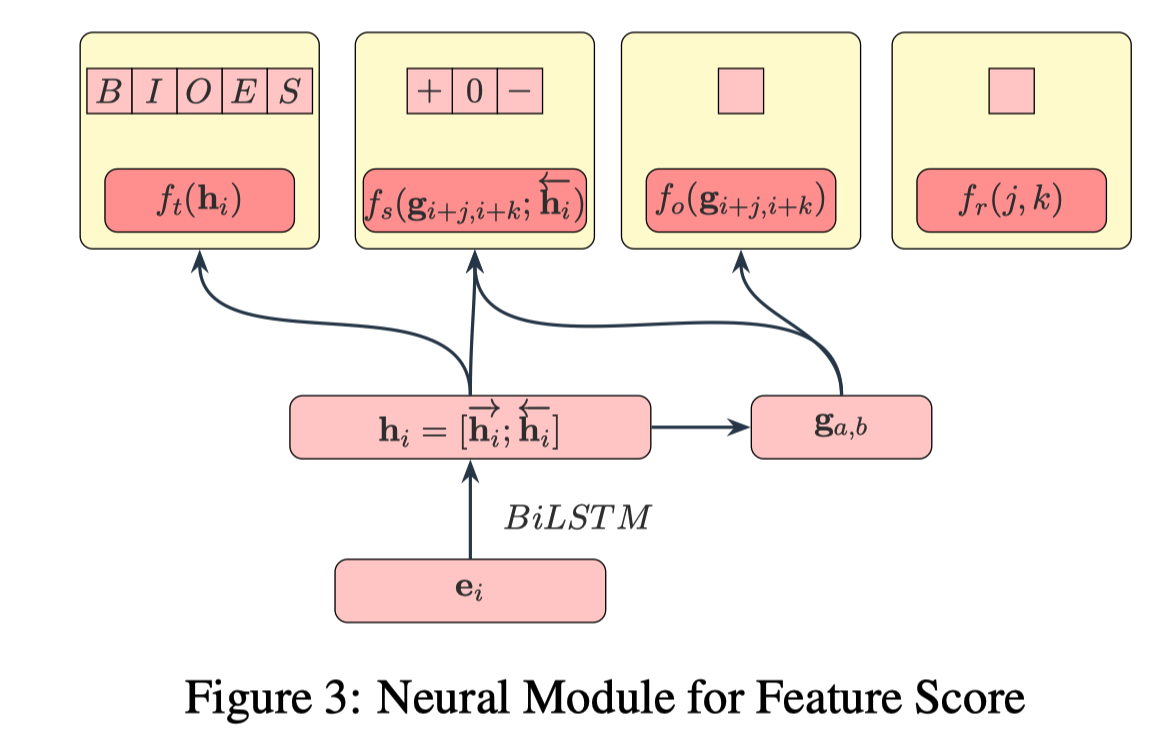 - f_{s}\left(\left[\mathbf{g}_{i+j, i+k} ; \overleftarrow{\mathbf{h}_{i}}\right]\right)_{\epsilon}+f_{o}\left(\mathbf{g}_{i+j, i+k}\right)+f_{r}(j, k)