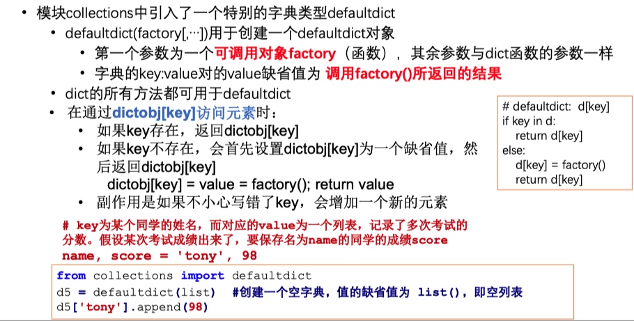 d5 = defaultdict(list) #创建一个空字典,值的缺省值为 list(),即空列表