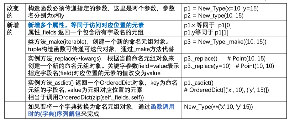 - 使用上述创建的新类型,调用相应的构造函数(通过位置参数或关键字参数传递来指定对应位置的元素)创建一个命名元组对象,该对象可以使用原有元组类型的所有方法