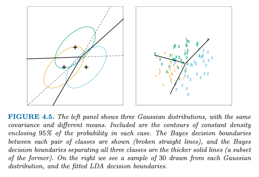 - LDA is fit by maximizing the full likelihood \operatorname{Pr}(X, G=k)=\phi\left(X ; \mu_{k}, \Sigma\right) \pi_{k}