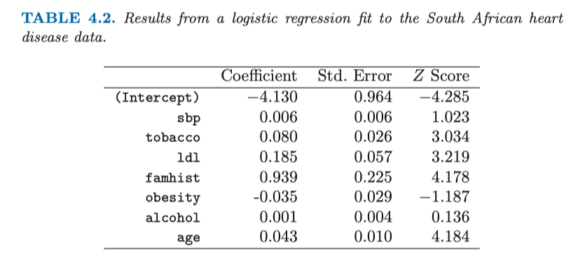 参数的解释: 例如对 a coefficient of 0.081 (Std. Error = 0.026) for tobacco, 可以解释为 an increase of 1kg in lifetime tobacco usage accounts for an increase in the odds of coronary heart disease of exp(0.081) = 1.084 or 8.4% 结合残差可以得到 an approximate 95% confidence interval of exp(0.081 ± 2 × 0.026) = (1.03, 1.14).