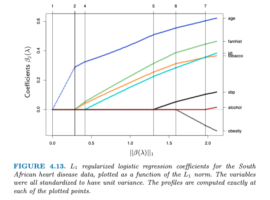 Maximize a penalized version of the log likelihood \max _{\beta_{0}, \beta}\left\{\sum_{i=1}^{N}\left[y_{i}\left(\beta_{0}+\beta^{\top} x_{i}\right)-\log \left(1+e^{\beta_{0}+\beta^{\top} x_{i}}\right)\right]-\lambda \sum_{j=1}^{p}\left|\beta_{j}\right|\right\}