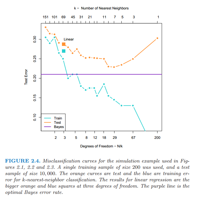 这里展示了在一个数据集上(更适合 kNN)的表现, 紫色为 Bayes 错误率, 两个方块是线性模型的表现, 而两条折线则是 kNN 在选择不同参数时的表现.