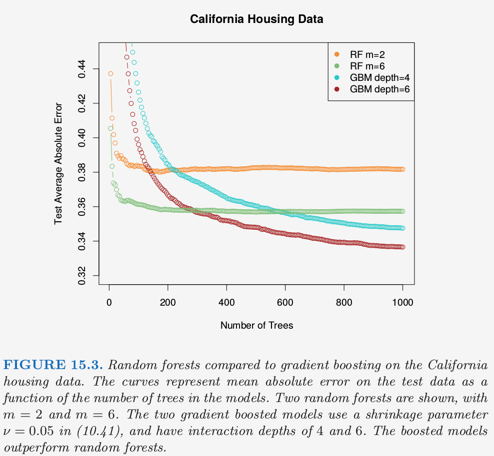 Bagging 的核心思想是对许多有噪声但近似无偏的模型进行平均,也因此降低了方差.树是用于 bagging 的理想模型,因为它们可以捕捉数据中复杂的交叉项,而且如果树长得足够深的话,会有相对较低的偏差.因为树是充满噪声的,所以通过平均可以很大程度地改善它们.而且,因为 bagging 中产生的每棵树是同分布的,B 棵这样的树的平均的期望与它们中的任一个是相同的.这意味着经过 bagged 的树的偏差与单个(bootstrap)树的偏差是一样的,而且唯一改善的希望是通过降低方差.这与 boosting 是相反的,在 boosting 中树以一种自适应的方式减小偏差,因此不是同分布的.